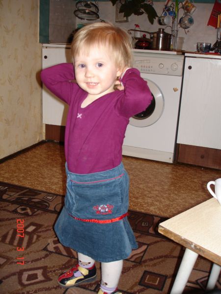 Да, я теперь ничего не берегу "на выход". Потому как выходы случаются редко, а из вещей Викуська катострофически быстро вырастает. Поэтому все что есть - все носим дома. А эту юбку она сама полюбила и теперь требует ее каждый день одевать. |