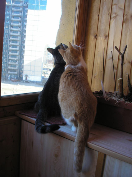 Сегодня сделала фотку смешную - оба охотятся на голубя за окном