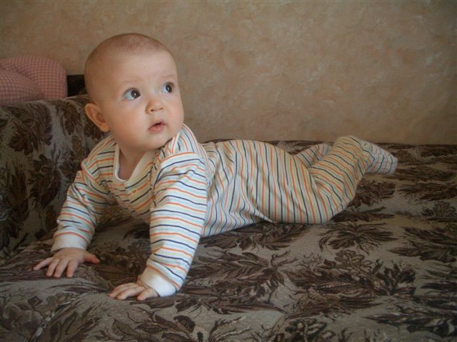 Умеем: наше достижение за этот месяц – мы научились ползать на четвереньках, а не по-пластунски как Моресьев, вставать на коленки в кроватке, иногда встает на ноги в кроватке – чем меня не очень радует. Надо отползать 1.5 месяца. По-прежнему нету слогов в нашей речи сплошные крики. Зубы так и не радуют нас своим появлением.