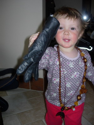А вот и наши фотки (сегодняшние). Соник нашла бусы мое юности и теперь в них красуется, ну и перчатки мы тож уважаем!!