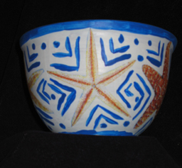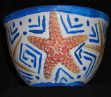 А вот с голубым орнаментом, это идея моего сыночка, нока я пошла пересыпать ракушки на подносик, он взял фломастер и………………., в общем, что смогла акрилом подправила, но идейную линию изменить не смогла. |