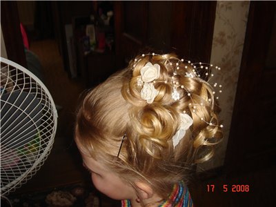 У меня подруга сегодня доче вот такую сделала- лень ей было все волосы " накручивать", так она сначало хвостик сделала.Скорей всего с такой на выпускной и пойдем, только с челкой что нибудь надо сделать( уже сил на нее не осталось, закололи чем было
