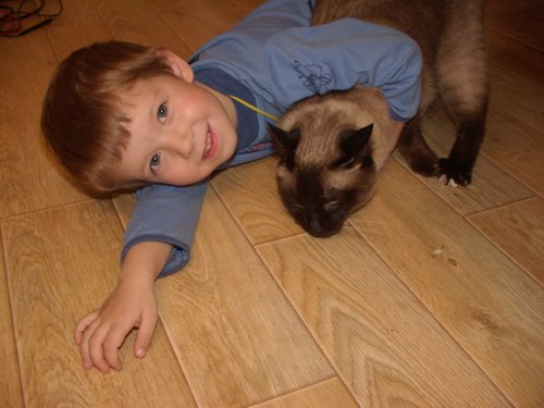 Мой Филипп так обожает нашу кошку... как бы она дух не испустила... Хватает ее, и давай таскать из кухни в комнаты и обратно и так до бесконечности. Или вот еще, оденет свисток (жаль на фотке не видно), подойдет к ней тихонечко и как свиснет в ухо, та мяукает дурным голосом, а детина ржот на весь дом. Никакие просьбы и угрозы не помогают. Щас сидим дома с соплями, так бабушка наша уже на грани нервного срыва. Вот подумываем еще малявку завести, так боюсь игры будут как с кошкой. Умаялся малыш, спит... |