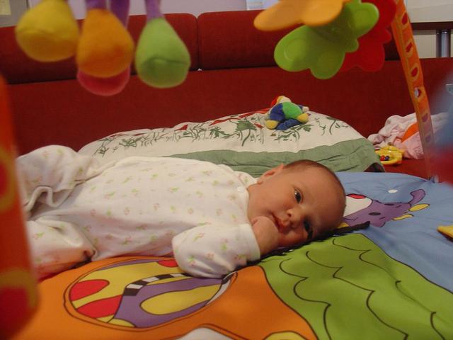 Она вообще на игрушки странно реагирует, иногда лежит и рассматривает комнату, ставишь перед ней игрушку, она возмущается, а иной раз лежит и смотрит на них, смотрит...
