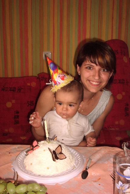 На столе только фрукты, овощи, ну вообщем все что можно малышу! Купили торт с бабочками, одна свечка музыкальная (Вовке очень понравилось). В торт естественно сразу же залез руками, ну очень смешно!
