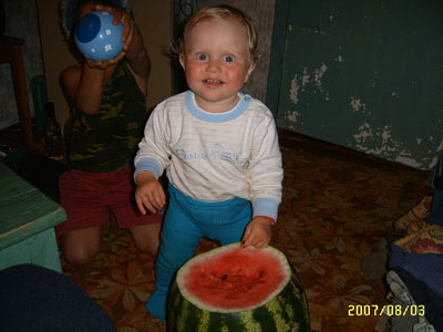 Мы отметили очень своеобразно,по-деревенски,но с тортиком и свечкой,шариками и просто весельем,в том числе и детским. А 3 августа сестра мужа родила племянника Вениамина - опять праздник! Девочки,я так скучала!Вы мне аж снились,причем 2 беременных - Олеся и еще кто-то. Отдыхалось нам замечательно - надышались свежим воздухом (сегодня по городу долго гулять не смогла...), накупались - Ромашка тот еще морж,но контролирует - зайдет,поплещется и на песочек. Устала спорить со свекровью и другими бабульками о воспитании,ГВ (я тут добралась до Цареградской и т.п. - похоже,буду кормить до самоотлучения,хотя при чем тут книжки - просто нам обоим очень-очень приятно,ну и пусть ночью мы присасываемся как следует!) Оказалось,что быть вдвоем с ребенком - самое лучшее!Сначала я боялась,но глаза боятся,а руки делают,к тому же ребенок там спал подолгу - все успевала,еще и читать!Потом испробовала роль мамы двух деток(5-летнего племянника подкинули) - ничего,но в какой-то момент случился полный усер,старший не мог по ливню бежать в туалет...По очереди вымыла,а пока грелась вода играли в догонялки,чтобы случайно не сесть. Ромашулька стал совсем взрослым - бегает вовсю,может долго играть в песочке и с другими детьми (никакого следования - пыталась его отвести от футбола,а то он бы за мячик сошел,ушла в поле - сын не оглянулся!) Болтаем вовсю - кроме обычных мама-папа-баба-деда-дядя говорит многих животных,а если мама затрудняется,сам сочиняет,например,бабочка у него кар!Почему?А машинка не маминка и не биби,а дудо.А еще целая куча непереводимых слов. Ну и наши фотки 1.Ромочке 4 дня 2-4.В деревне |