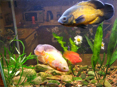 4 астронотуса -размер около 25 см- из низ 2 оскара белых , 1 золотой-красный, 1 тигровый + цихлиды 2 шт( названия точно не помню, одна маленька серо-коричневая , другая- красивущая черная с пятнами синерадужными) + 2 сомика шипованных можем привезти к вам |