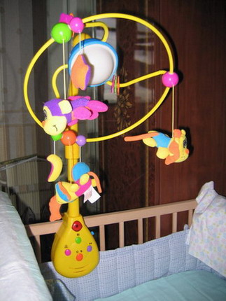 Я не помню, кто спрашивал про карусель... Покажу свою, мы хотели купить "Звуки леса" (Tiny Love) но нам сказали , что их сейчас не найти - на складе фирмы поставщика нет. Но мы нашли неплохой аналог. Бельгийская фирма BabyBaby - 6 классических мелодий, 6 звуков природы, мягкая подсветка...