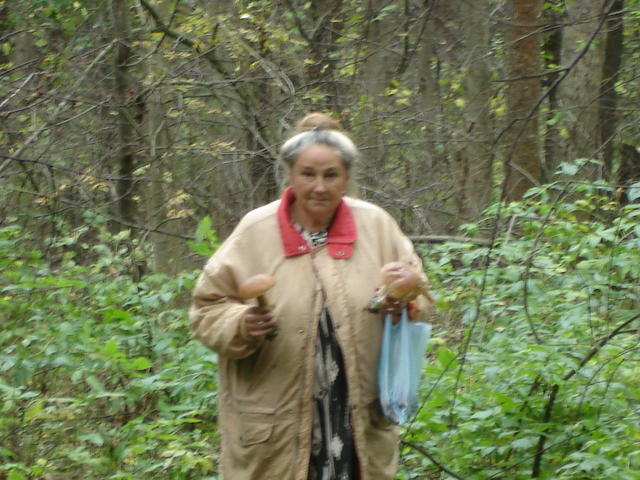 А это мы на выходных за грибами ходили =) Свекровь добычу несет - два белых. А Лиза с нами на колясочке ездила по дорожке вокруг леса.