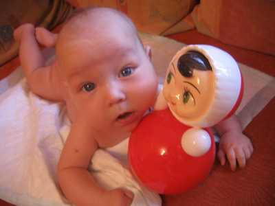 Ванечка - младший (есть ещё сестрёнка Даша, 5 лет). Родился 22 июня. На приёме в три месяца весили 9200. Что будет дальше не знаю. Просто боюсь. Родился 3570. Привсём при этом когда не спит очень активный. Почти сел. Ну это уже не интересно. Надо встать.