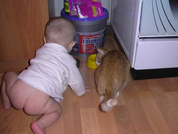 А как он ползает видно на фото с кошкой: левую ногу ставит в сторону на подошву, а правую на коленку, как бы подволакивая, причем по другому не ползает, только так. А после того, как начал так ползать, и ходить стал криво: левую ногу поднимает как солдат, а правую приставляет на носочке.