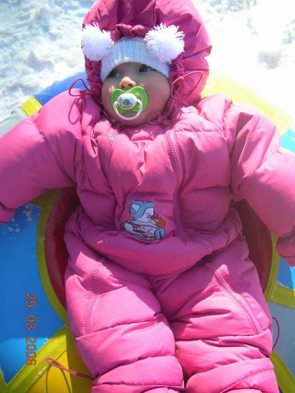 А моя красота наконец начала шустро передвигаться на четвереньках, а не баттерфляем! :suport: Такая смешная! А еще мы начали пить бифидумбактерин - который в стеклянных бутылочках по 200 грамм. Из рожка с соской, и Полюнику понравилось! И на последок покажем вам мартовскую фотку - на ватрушке в гости к зубрам: |