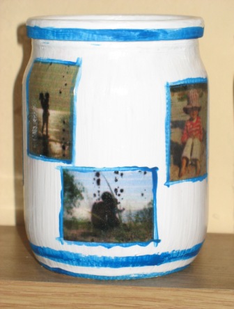 Еще мы папе хотели сделать стаканчик для ручек. Вместо салфеток- распечатанные на салфетке наши фотки уменьшенные. Но что-то не очень как-то получилось. Синим это я специально не аккуратно