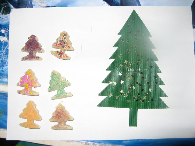 ПОДГОТОВКА К НОВОМУ ГОДУ !!! ![]() На неделе вдарили по елкам. 1.Елка и шарик на елку. Делал мальчик Никита у меня на занятиях, возраст ДО ГОДА ( боюсь ошибиться , но примерно 9 месяцев , +\- один месяц). Конечно, с помощью мамы, но пинимал активное участие. 2. Елки можно украшать чем угодно. Моя Сашка наделала трафаретом из соленого теста ( можно брать пластилин , а лучше массу для моделирования), потом обсыпала. Я сделала еще в мягком тесте дырочки и теперь повесим на елку. По такому аналогу можно делать кого-угодно. Обсыпка : цветной песок, кондитерская обсыпка, бисер ( 2 елки) и соль для ванны ( 2 елки). Там же. Елка из гофрированого картона и блестки. Хорошо смотрится бархатная бумага. 3. Опять трафарет елки и блестки. Эти колючки мы будем использовать для дикорирования подарков. Пример показан. Любая коробочка или сверсток становится сразу новогодним, на мой взгляд. |