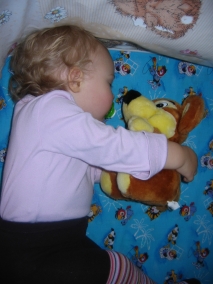 Я сегодня днем стала свою лялю спать укладывать, она ни в какую. Соскочила с дивана и побежала к игрухам. Взяла мышонка в руки. Ну я ее в кровать положила и думаю пусть засыпает. Сначало минуты 2 попищала, а потом тишина............... Я захожу в комнату, и там такая картина..................... Ну я конечно не могла это не сфоткать