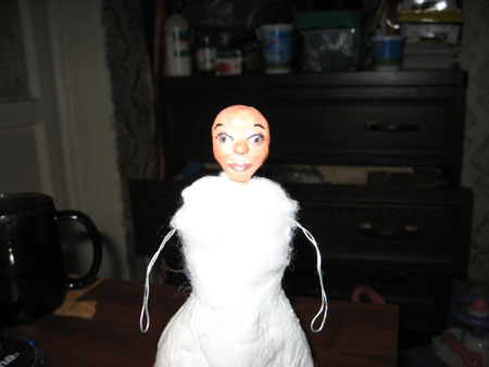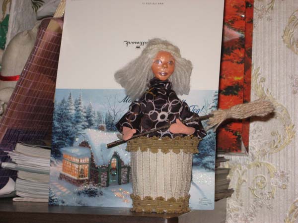 Хотела к новому году сделать ангелка..........)))))).....ну.......не вышло у меня))))) первая фотка - это попытка обклеить каркас ватой........ вторая - что на данный момент ))))) Новогодняя баба яга несмотря на то, что мокала всю голову в акриловый лак, глазки и брови стерлись, нужно будет дорисовать снова, ну и ручки доделать. |