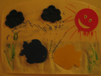 Сначала нарисовали небо, травку, море акварелью. А потом клеили вырезанные фигурки и облачки из пластилина и дорисовывали фломастерами |