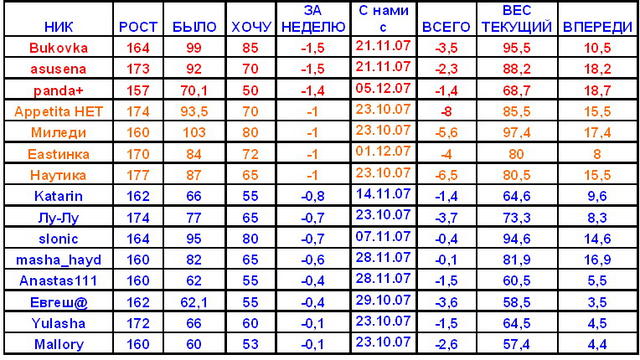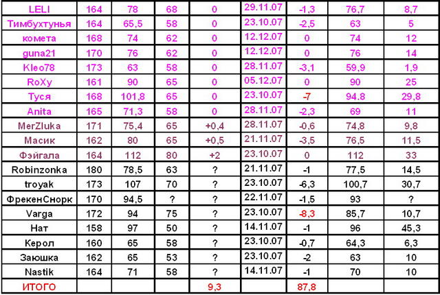 выразить ОГРОМНОЕ восхищение девочками, которые не смотря на скромные результаты, а то и привесы, не теряются, не стесняются, а вместе со всеми идут к намеченной цели! Особенно меня восхищает Фейгала ![]() |