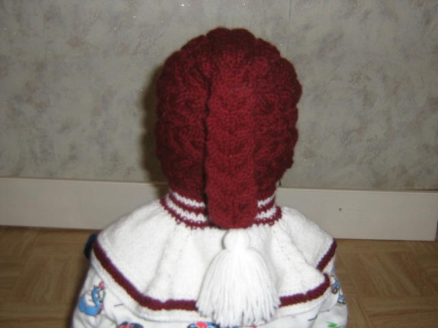 Ну, основа-то от Viv, как я и сказала. Сначала резинку от лица, потом перешла на бордовый цвет с узором. Там смежные косы, перекрещивание навстречу друг другу и лицевые петли на фоне изнаночной глади то сходятся друг к другу, то расходятся. В общем-то банальный рисунок. Единственно, здесь я вязала на прямых спицах (в авторской идее вся шапочка вяжется по кругу). Когда вязание дошло до нужной глубины - затылочная часть - постепенно начала убавлять петли. Когда на спицах остались петли только центральных двух косичек, добрала по 6 петель с каждой стороны и вязала косичку нужной длины. Все петли закрыла. Шапочку сшила по затылочному шву и по косичке. Потом набрала петли по линии шеи, снова дальше все вязала по кругу. 4 см резинкой. Потом разделила петли на 4 части. Теперь вязала так : основной фон - изнаночная гладь, по углам - косичка из четырех петель. В каждом 4 ряду прибавляла петли слева и справа от каждой косички. А конец - снова по авторской модели - платочная вязка. В самом конце сделала кисточку из белой пряжи. |