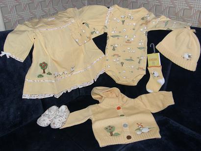 Платье с овечками с вышивкой еще и с трусиками, ХБ. Шапочка и кофточка тоже хлопок, но типа вязаный. Бодик тепленький - двойной трикотаж оказался. Ну тапочки ваще тока маленькие они, надо было больше на размер брать... теперь со смехом жду такие на размер меньше и носки трикотажные - все тема с овечками.