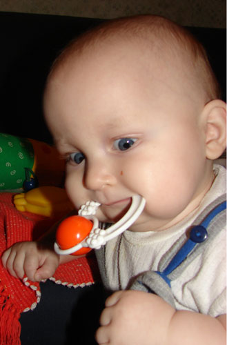Игнат сделал из погремухи что-то вроде варгана - засовывает в рот и дергает рукой за погремуху. Она звенит, Игнат радуется