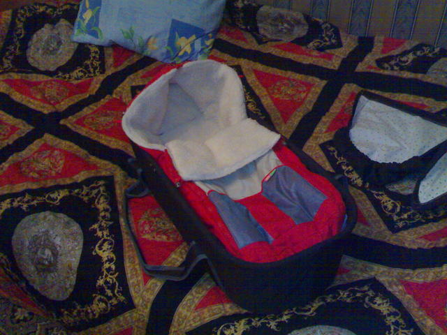 каляска на даче,но переноску покажу, я ее уже приготовила. (она с кол. продавалась) еще меховой мешок и покажу я вам наше кресло-шезлонг. он может и горизонтально быть. |