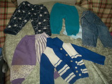 Пакет ползунков и кофточек,поношеных не одним ребенком.Новые вязаные костюмчики,не фирменные.