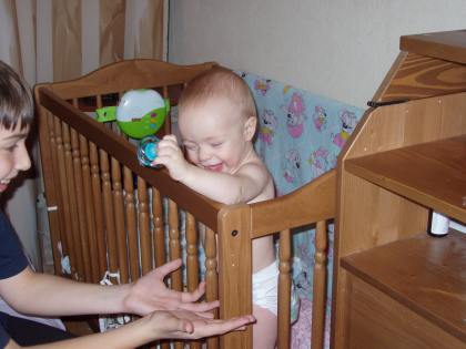 Это любимая игра моих детей. Вечером после купания младшенький просит, чтобы его в кроватку пустили. А вот дальше... Соска сначала нечаянно падает на пол... Старший поднимает. Потом пытается поймать её раньше, чем она туда упадет. А младшенький всеми силами пытается его обмануть: делает вид, что берет её в рот, а потом швыряет резко или начинает (соска при этом в руке) зубы заговаривать типа "ба-ба-па-ба-бра" и т.д. Как только зазевался - соска на полу! Или с задумчивым видом смотрит на лампу говоря при этом "ампа", финал тот-же.![]() Самое главное, что смеются при этом в покатуху оба! ![]() ![]() |