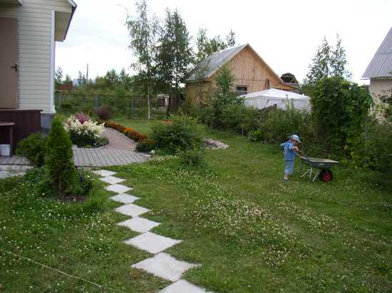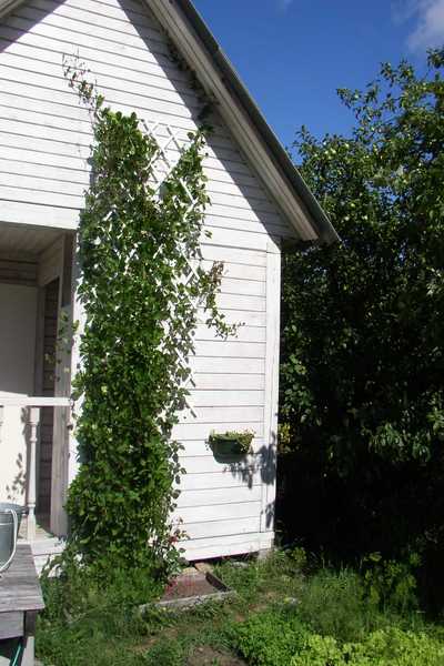 Для того чтобы быстро вилось можно кабею сейчас посадить семечками, а в мае посадить в ящики, все увьет, если теплое лето будет. Это кабея, залето во всю высоту бани вымахала, я замеряла 10 см в сутки растет, из одного растения и цветет такими фиолетовыми колокольчиками. А где деть тачку выгружает:-) вот там крона винограда. |