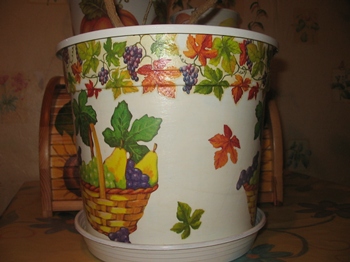 Девочки, принимайте еще одну подсевшую на декупаж. Тренировалась на кошках, т.е. на горшках. Получила огромное удовольствие от процесса. Самое противное было красить горшки. Краска вонючая, от рук не отмывается, сохнет долго. Зато процесс декупажа - супер! Первый блин, как водится, комом. Даже показывать не буду. Отдекупажила бутылку. Она получилась блеклая и мутная. А вот горшки очень даже ничего. Ну и хлебница в подсолнухах.