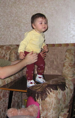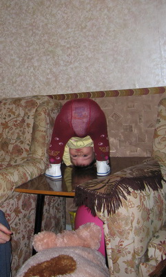 ![]() Залезает на стол с дивана, а оттуда ныряет в кресло. Хорошо, что мне на день рождения подарили здоровенную подушку-свинью. она у нас вместо мата. Папа пытается не дать ей встать, наивный. |