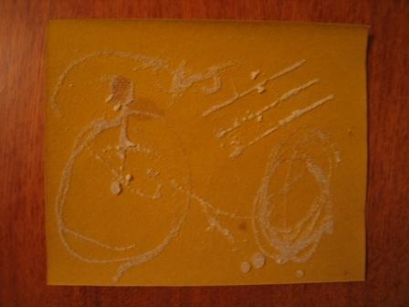 Рисунки манкой. Я наливала клей, дочка сыпала манку. На последнем рисунке дочка делала все (кроме трех параллельных линий) сама: и наливала клей и сыпала манку. Вообще за этот вечер мы с ней сделали около 10 рисунков и еще парочку с папой. Манка оказалась хитом.