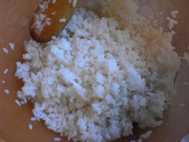 Я варю рис строго два стакана риса и два с половиной стакана воды ( иногда советуют в других рецептах воды меньше) но я делаю так. Рис очень хорошо промываю , чтобы вода стала прозрачной , высыпаю на полотенчико и промакиваю рис чтобы лишняя вода ушла. Далее кладу рис в латку с толстым дном,заливаю два с половиной стакана воды (холодной) накрываю крышкой и на большой огонь . Как только закипит сильно поварить 1 минуту на этом сильном огне, затем убавить на минимум и оставить варит 10 минуток. После выключить и еще дать постоять рису несколько минут в закрытом состоянии чтоб распарился до конца. А вот потом вывалить рис в миску и не мешать!!!! От этого он становится кашей!! Чуть остынет залить уже приготовленной смесью уксуса соли и сахара ( заливать по чуть чуть и очень аккуратно деревянной лопаткой резать рис , но не мешать как кашу!!!) должны пропитаться все рисинки. Я еще обмахиваю веером над рисом когда заливаю смесъю ( это говорят убирает лишний уксусный запах) Все . Оставить рис охлаждатся до комнатной температуры или чуть теплее можно, накрыв полотенцем.