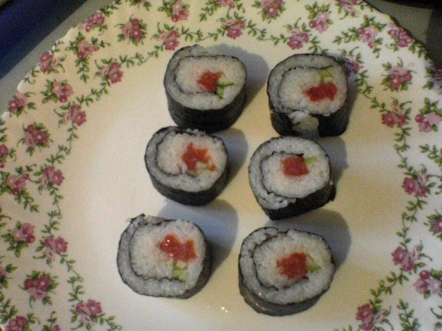 но вкусно. Только рис мне не нравится, я покупала рис для японской кухни Sushi, такой в черно-красном пакетике. Он разварился до однородной массы и очень чувствовался вкус риса... Подскажите, какой рис используете вы (не из наборов)? Вот чтобы после варки получался как в ресторане - вязкий, но все же крупинками. Варила все по правилам, не переваривала. В общем хочу услышать советы! А вообще сложного ничего нет, не все ровно конечно получаетсЯ, но получается! нужен просто навык. и конечно острый нож. С моими тупиками только портить все! |