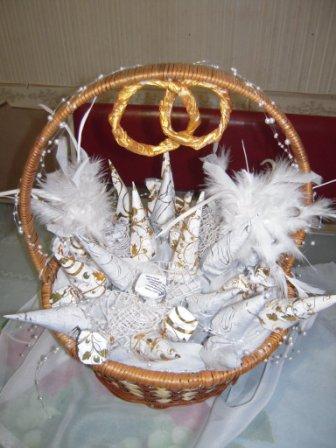 Можно было еще в качестве композиционного центра что-то в корзину воодрузить и поддержать тему свадьбы и золотых колечек - например, фигурку молодоженов, или голубя, или шампанское, или даже 2 фужера для шампанского. Голубь, кстати, перекликался бы с перьями в корзине. А для первого опыта - прекрасно получилось! Продолжайте! ![]() |