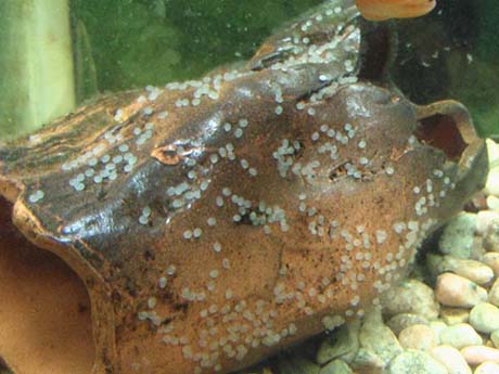 Простите, а цихлиды все так равномерно по коряге икру размазывают? я видела кладку скаляров - вполне такая компактная, ровненькая.... да и как бы рыбы ПОД корягу ее отложили?