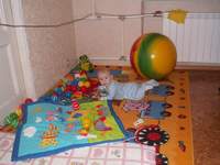 одеялко синтепоновое вполовину сложенное - это "мягкое место", на нем - пенковый коврик-пазл с цифрами (от старшего остался) - это "твердое место" для ползания. рядом - типа резиновый коврик для ванной - это где я лежу, когда хочу полежать ядом. по всему этому делу - подушки, игрушки, огромный меховой далматинец. и все равно ловлю на полу все время...