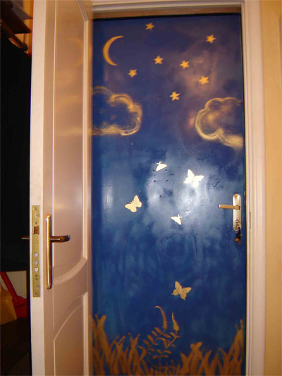 А это наша металлическая дверь в квартиру. Была разрисована мною за два дня красками в баллончике (синяя и золотая; куплены в "Домовом" и "Лукоморье" за 90 и 72 руб.); я использовала трафареты - старые детские пазлы, ну и из бумаги кое-что вырезала. Называется "Дверь в лето". Разрисовывалась в Новый год.