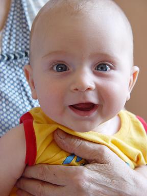 Макса покажу- он у меня жуткий смешарик- хохотунчик, смеется ну просто от всего- мячик бросаешь или сестрица танцует, а уж если из-за угла выглядывать и потом прятаться, то вообще до визга. У меня дочка так не смеялась, так что мне непривычно так