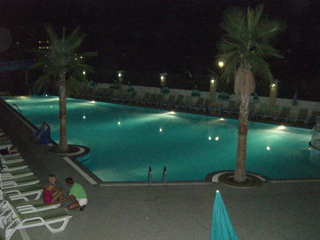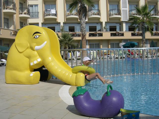 нас было 6 человек-четверо взрослых и два чилдрена по 4 года.вылетали в пятницу вечером,рейс задержали часа на полтора.полет прошел хорошо,наш егоза сидел все четыре часа как лапушка, немножко поспал,что-то поел,попил. прилетели где-то в час ночи по их времени. у нас легкий шок- температура+39.выходим,сразу в нос ударил влажный и горячий турецкий воздух. быстро сели в автобус,там спасительный кондей,от которого приходилось прятать детей,т.к. очень боялись перепада температур.Ехали часа 2.5,заезжали где-то в 10 отелей,были предпоследние.Приехали,заселились быстро.(правда потом меняли номер). Выспались,пошли в бассейн,потом на обед,вечером на море,до которого идти минут 5. это дорога на море отель сам по себе небольшой-где-то 5000кв.м,вся территория -это бассейн,детский бассейн,бассейн с джакузи,небольшая площадка для вечерних представлений. .есть две водные горки,которые работают 2 часа утром и два часа вечером. |
