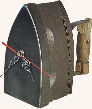 Этот утюг угольный, крышка поднимается, внутрь горящие угли засыпаются, так что часы есть куда вставить, надо только дырку для стрелок просверлить и механизм вставить.