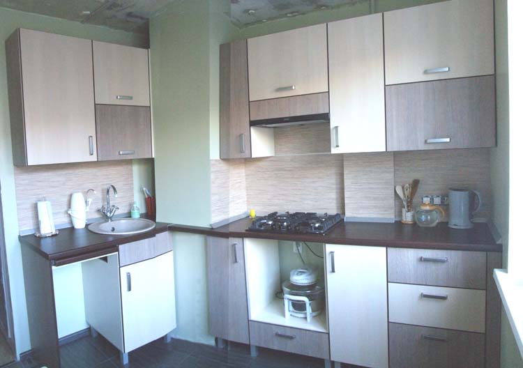 Пустующее пространство наискосок под мойкой - место для ПММ, под варочной - для духового шкафа. Ниша за мойкой между нижними и верхними шкафчиками закроется ламелями.