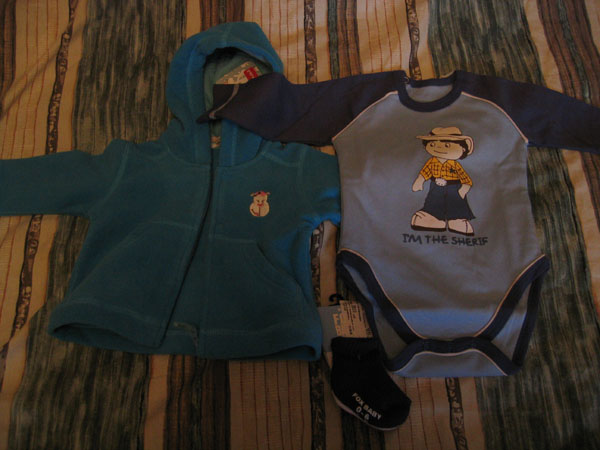 Что-то с моим мужем произошло,его наверно кто-то укусил-он 3 часа терпеливо ходил со мной и ни разу не произнес свои коронные фразы:давай быстрей!!!!пошли отсюда!!!!ну что ты так долго!!!! Мы попали на большую распродажу в Фокс Кидс-70% скидки:бодики по 78 руб., наборчики из комбезиков 3 шт. 250 руб. где-то, курточки флисовые по 100 р., носочки дешевые, футболочки,курточки даже рублей по 250 руб.-но мы не стали брать-он же ходить еще не будет,зачем ему курточка такая маленькая на 6 мес.???? В общем,я довольна:хотя у нас уже все было для детя и до этого,но тут грех не прибарахлиться Ну вот пару вещичек: |