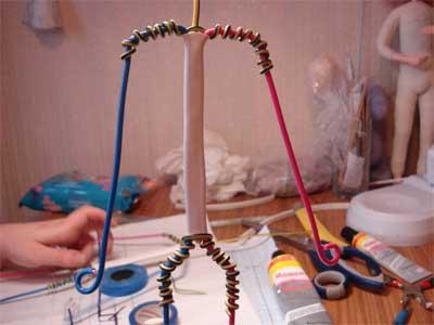 Для расчета высоты тела за исходные данные можно взять размер глаз. Если глаза равны 10 мм, то ширина головы будет равна 10мм*5=50 мм. Высота головы будет равна 50/2*3=75 мм. Высота мужского кукольного тела равна 8 головам, женского - 7 головам, 60 и 52,5 см соответственно. Точно так же можно рассчитать необходимый размер глаз, заранее зная высоту куклы. Рассмотрим порядок изготовления каркаса более подробно. Для начала вооружимся необходимым набором инструментов и материалов. Нам понадобится: проволока 3х1,5 или 4х1,5 (для стоящей куклы) в оплетке, проволока 1,5 медная для укрепления суставов, кусачки, плоскогубцы, канцелярский нож, клей момент кристалл, изолента, синтепон, ножницы, нитки для джинсы, игла, схематичное изображение тела куклы со всеми размерами (можно от руки). Проволоку в оплетке выкладываем на чертеж, изгибая плоскогубцами в нужных местах: плечо, шея, низ спины, тазобедренный сустав. Длину проволоки в руках и ногах оставляем чуть больше чертежа - всегда лучше потом отрезать, чем обнаружить нехватку каркаса в момент крепления пластиковых деталей. Сделав поперечные надрезы на шее и тазобедренном суставе, снимаем оплетку с проволоки, оставляя ее только на позвоночнике. Сверяемся с чертежом на предмет соответствия плечевых и тазовых сгибов. Теперь нам нужно "разделить" проволочный каркас на правую и левую половинки тела: ненужную третью проволоку между ногами обрезаем. Концы проволочек закругляем, чтобы они не мешали в работе. Плечевые и тазобедренные суставы необходимо укрепить проволокой 1,5 мм во избежание поломки во время частых сгибов. Вообще, лучше как можно реже сгибать проволочный каркас, а следовательно, необходимо заранее тщательно продумать позу. Заматываем каркас изолентой. Синтепон нужно нарезать на длинные полосы. Взяв каркас одной рукой, другой начинаем плотно, перекручивая, наматывать синтепон на проволочную основу - виток за витком. Сначала мотаем от бедер вниз к ногам; дойдя до конца ноги, возвращаемся вверх, наматывая синтепон плотно, но плоско. Остатки ленты обматываются вокруг позвоночника и фиксируются иглой и ниткой. Точно так же обматываем вторую ногу, руки и позвоночник. Каркас готов! Следующим шагом к кукле будет формирование объема тела и обшивание его трикотажной тканью с добавлением анатомических выпуклостей ![]() P.S. Сразу говорю - урок из интернета!!! Самой времени нет так долго писать ! Кукла не "отпускает"! Заработалась.... Но это так здорово...![]() Удачи!!! |