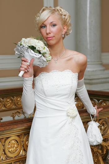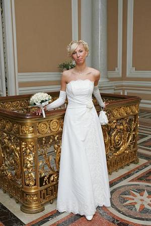 По просьбе трудящихся показываю свое скромное свадебное платье,на фото плохо видно,но оно по верху и подол расшит стразами