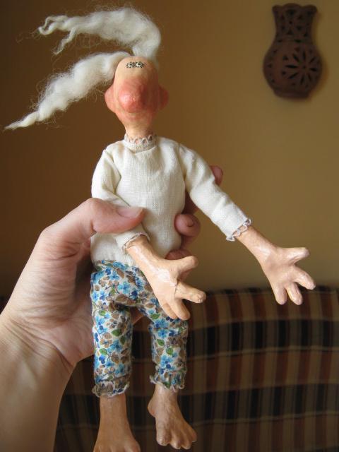 Как стилизация - очень мил.На шарикова похож.И хоттабыча (тот же актер). Чуточку только бы рот углубить - внутри его вдавить поглубже, чтобы по выразительности соответствовал глазам. Грязь лучше убрать после предварительного запекания - минут 10 на 90-100 гр - чтобы форму головки не испортить - уже отвердевшую протереть ваткой с растворителем - я разбавитель безацетоновый для ногтевого лака полюбила. Кстати вот, на всякий случай - вот один из первых моих, любимый.