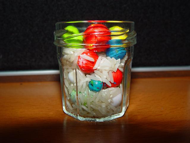Это мы сделали сегодня. Шишки разукрашивать пошли на ура, особенно прикреплять их на елку. А вот с бусинами разорванных бусов сразу скажу - по-моему рановато.(2 и3) Мы стали их разукрашивать, дочка запихала сразу все в краску, получились одни красные. я предложила их помыть, что бы сделать разноцветными, вот тут то началось веселье, бусины падали, катились, оставляя за собой разноцветные следы. но для 3-х летних , думаю, как раз, будет интересно. Когда наконец закончили, посушили их феном и положили в мааленькую баночку (25 гр) и насыпали риса. вот думаю, какую бы крыжечку придуматьВложение 941225
