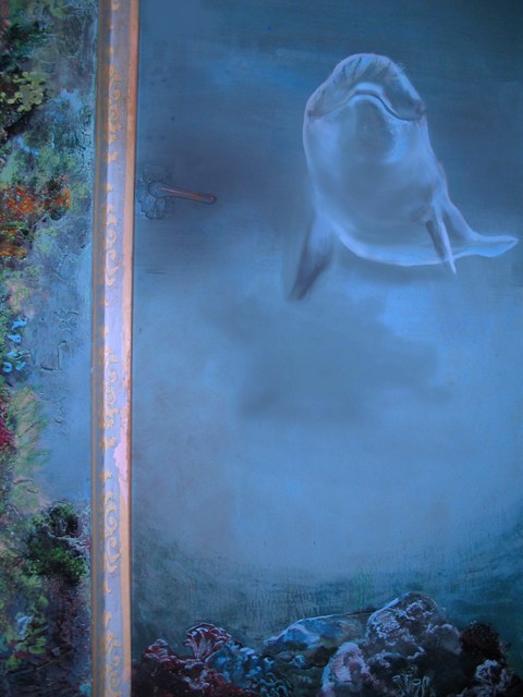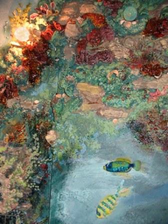 А может кто хочет кусочек подводного мира? (очень его люблю=) Да и детки ваши немного "ОКЕАНАРИУМА" хотели бы иметь у себя в комнате. Вот фото росписи у меня дома -это задекорированы двери в туалет, в ванную и в 2 комнату ( слишком много дверей на 2х метрах) .Над дверью в туалет вылеплена скалистая арочка с караллами ..Еще не доделала ремонт, но на одной двери будет русалка уплывающая в развалины затонувшего города. Колонна у двери.На полу плитка-галька. А на потолке приклеена потолочная плитка-рельефная с выпук. рыбками,коньками...и я ее покрасила..и всякое такое =)))