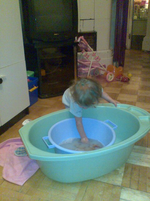 А вот прямо сейчас она посасывает губку с мыльной водой, сидя на ненавистном ей горшке... Если не заставляют в него садиться голой попой, то он отлично выполняет роль стульчика...