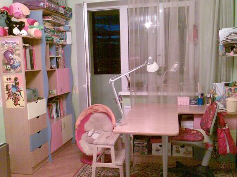 А еще в комнате стоит шведская стенка справа от двери и тумбочка с клеткой морской свинки. Метраж комнаты 14 кв.м. + балкон, но там кроме ковролина на полу, больше ничего не лежит и не стоит.